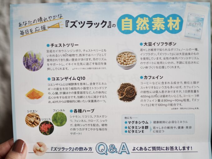 カフェインや大豆イソフラボンなど全て食品由来の素材でできているので、痛み止めや頭痛薬を飲んで痛みに慣れてしまうのでは?という罪悪感や心配がないのがいいですね。